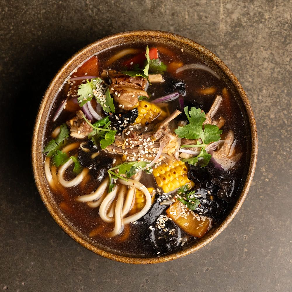 Наваристый говяжий бульон с домашней лапшой и бараниной на кости в соусе черный перец, грибы муэр, кукуруза, ростки сой, красный лук, перец болгарский, кинза, кунжут. 780 гр