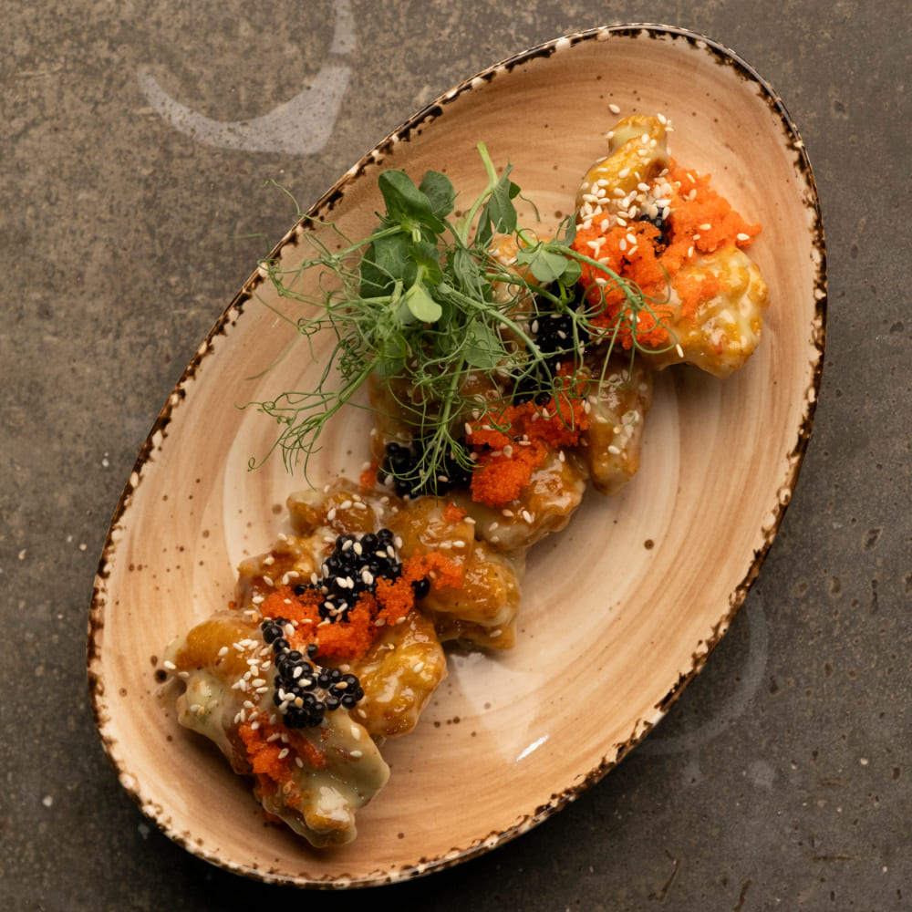 Тигровые креветки в кляре с икрой под соусом крем васаби.