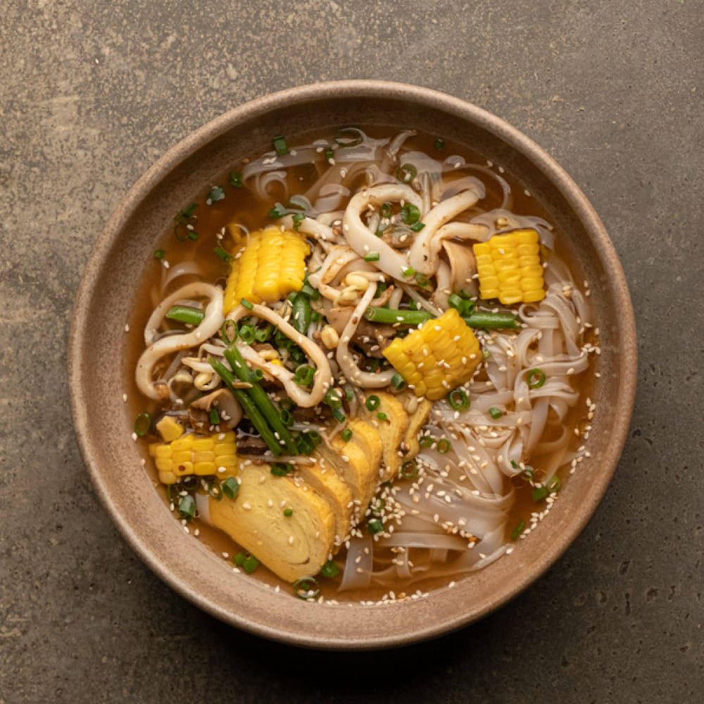 Пряный травяной бульон с устричным соусом. Рисовая лапша с миксом из овощей (кукуруза, стручковая фасоль, ростки сои), грибами шиитаке и шампиньонами, омлетом томаго, луком, кунжутом и кунжутным маслом.
