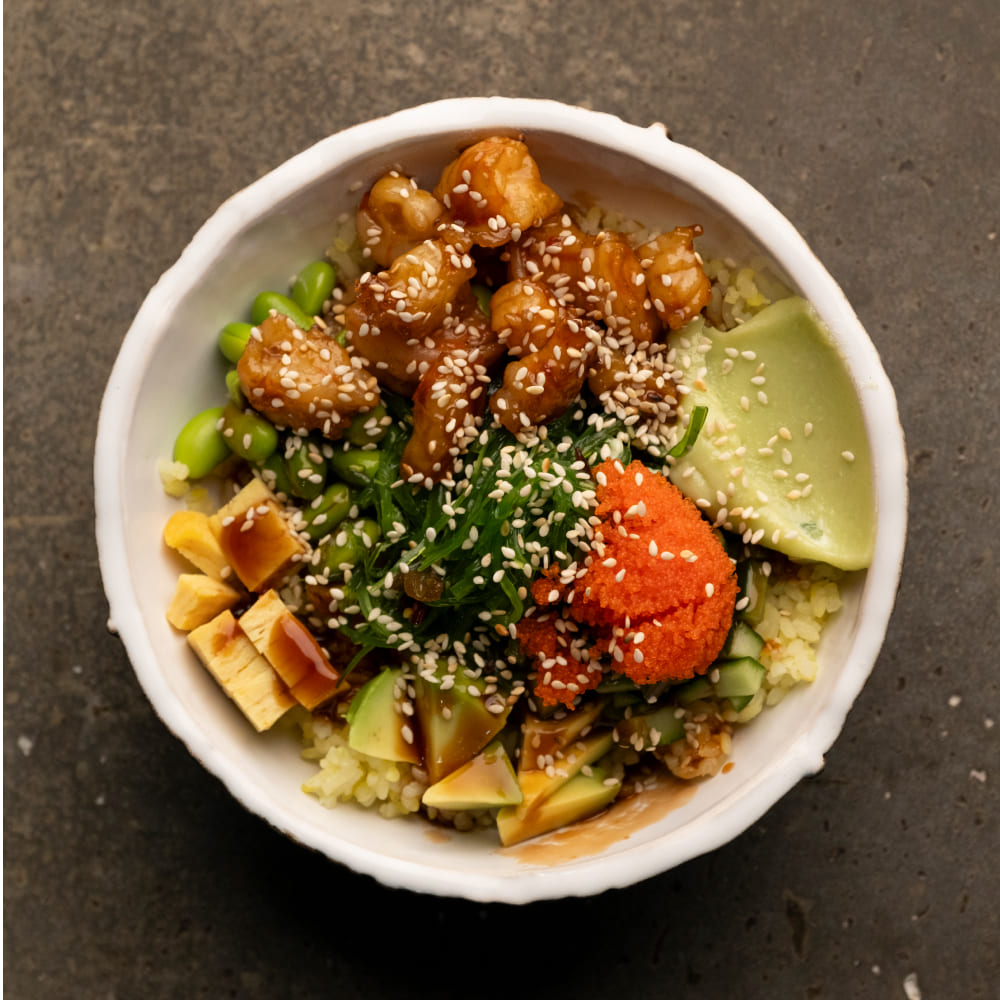 Теплая Гавайская закуска на основе пряного риса, бобами Эдамаме, огурцом, авокадо, омлетом, водорослями Чука, икрой и кунжутом. Соусом Тонкацу и крем-васаби.