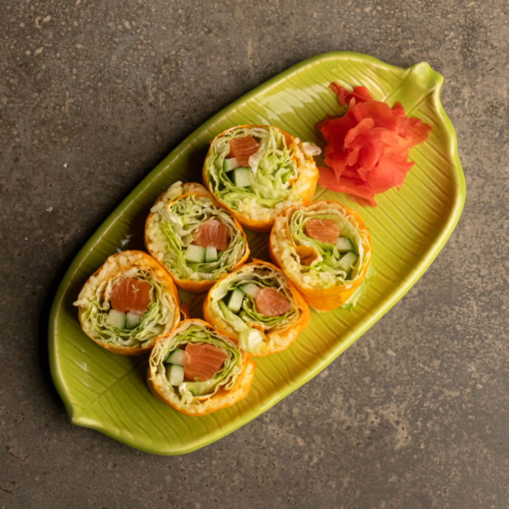Слабосоленый лосось со свежим огурцом, листьями салата (айсберг), пряным рисом, арахисовой пастой в соевой бумаге. Имбирь, кунжут и кунжутный соус.